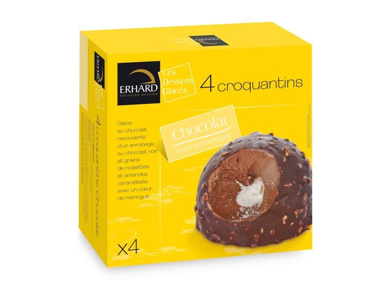 Glace chocolat, cœur de meringue, enrobage chocolat noir avec éclats d'amandes et noisettes caramélisées - produit surgelé.