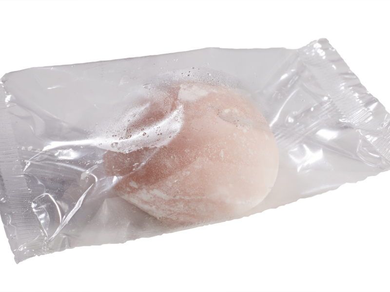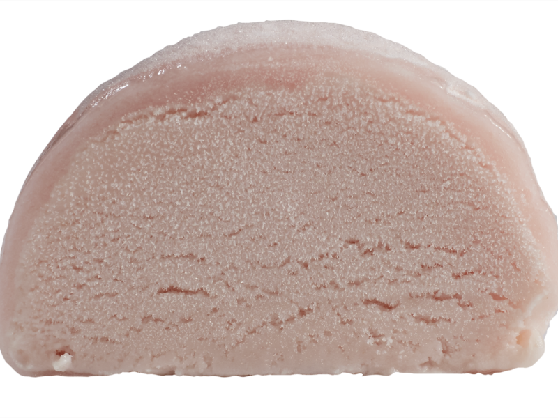 Crème glacée saveur fleur de cerisier entourée de pâte de riz sucrée cuite.