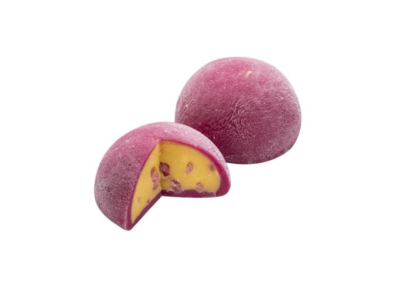 Sorbet plein fruit mangue avec sucre rose entouré de pâte de riz sucrée cuite.