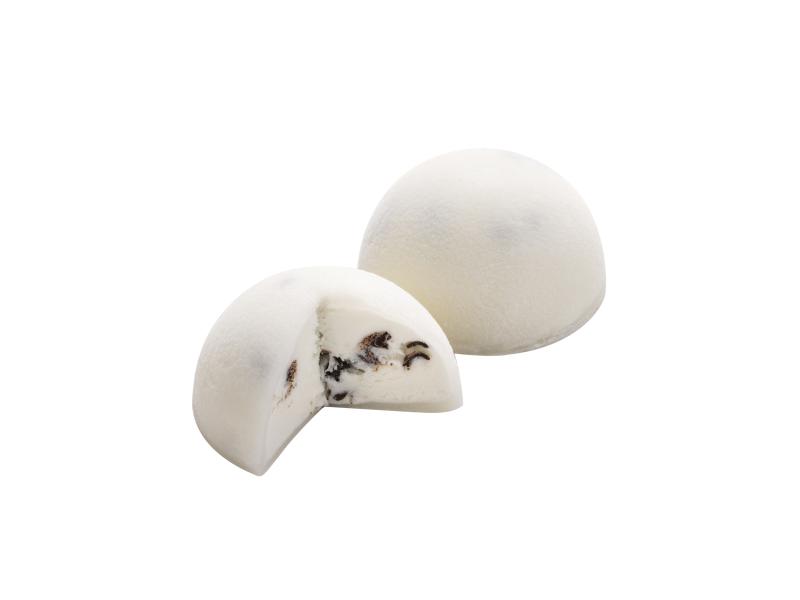 Crème glacée avec copeaux de chocolat noir, entourée de pâte de riz sucrée cuite.
