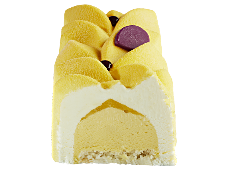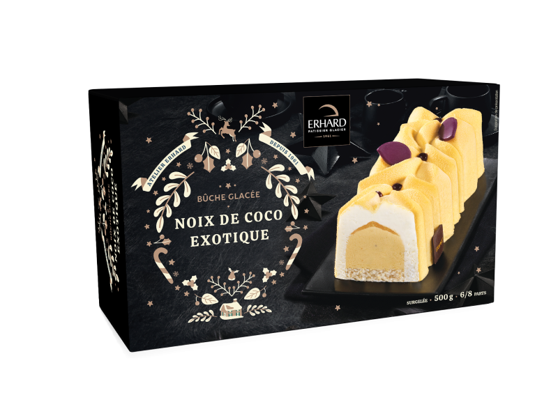 Bûche glacée composée d'une crème glacée à la noix de coco, d'un sorbet plein fruit à la banane et au fruit de la passion, d'un biscuit à la noix de coco, d'une sauce à la mangue et au fruit de la passion et décors - surgelée.
