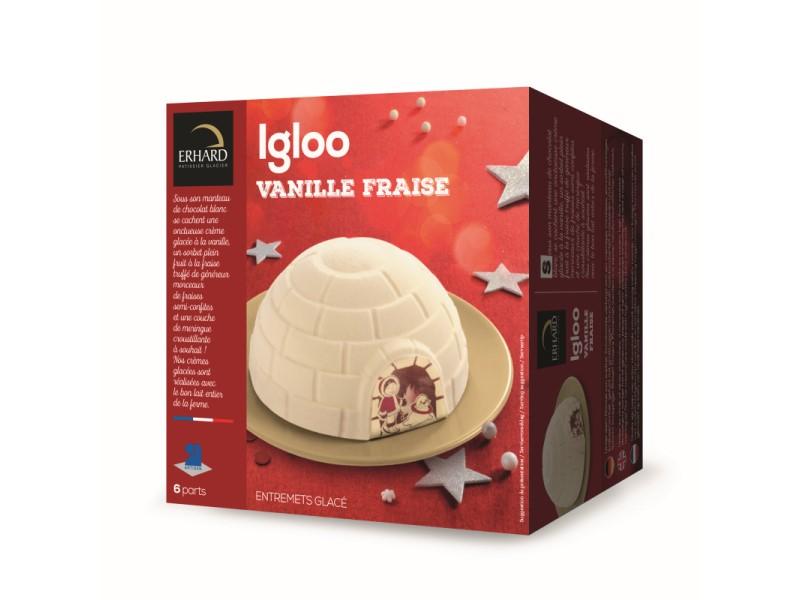 Crème glacée vanille, sorbet plein fruit fraise avec morceaux de fraises semi-confites et meringue - surgelé.