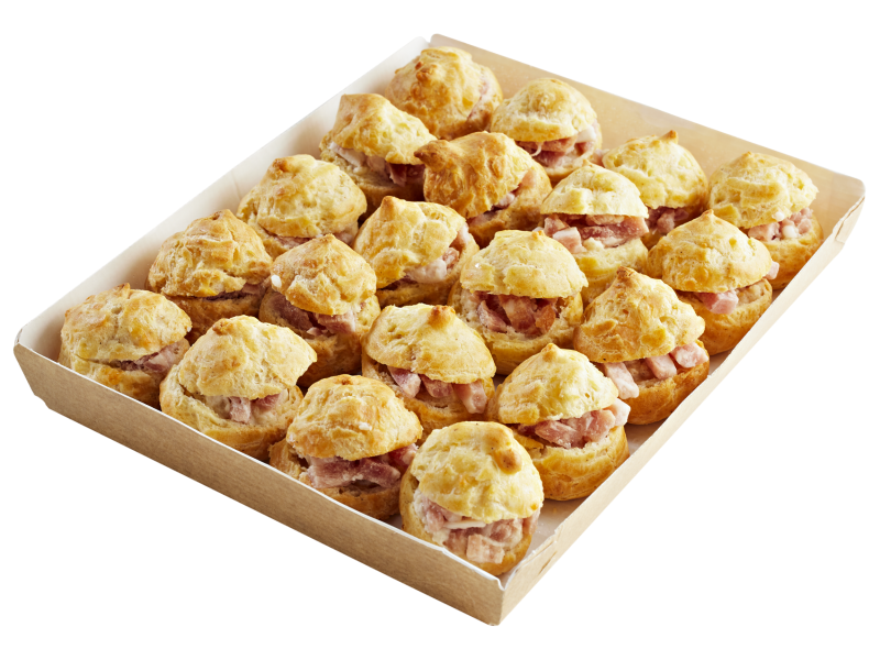 Gougères garnies d'une préparation à base d'une spécialité laitière au fromage blanc, à l'emmental, aux oignons et aux lardons cuits fumés - surgelées.
