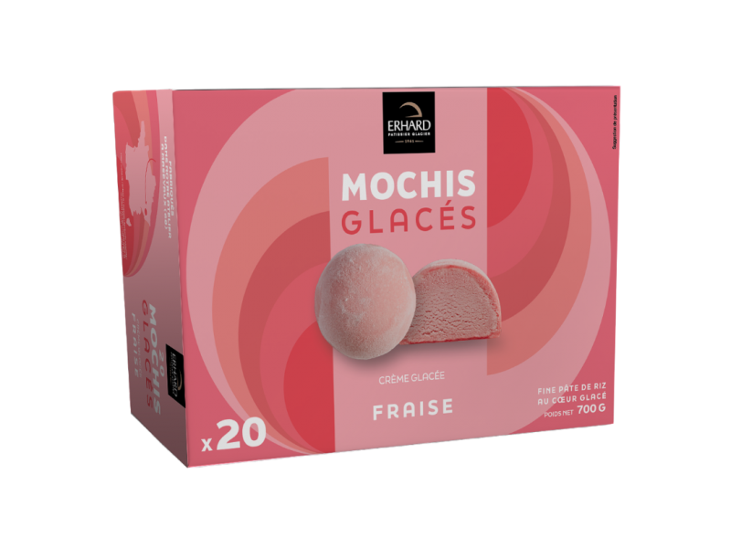 Entremets glacés composés de crème glacée à la vanille ou au litchi ou au citron yuzu ou au sésame (64%), entourée de pâte de riz sucrée cuite- Surgelés.