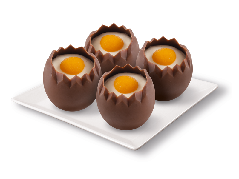 Entremets glacés individuels composés d'une crème glacée à la vanille 59% dans des œufs en chocolat au lait 37% avec un décor sauce à la mangue - produit…