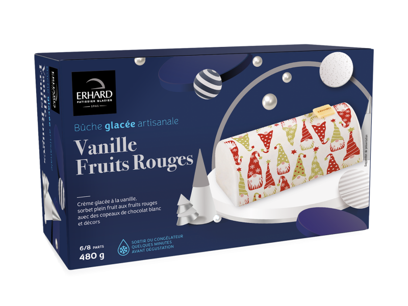 Bûche glacée composée d'une crème glacée à la vanille, d'un sorbet plein fruit aux fruits rouges avec inclusions de chocolat blanc et décors - surgelée.