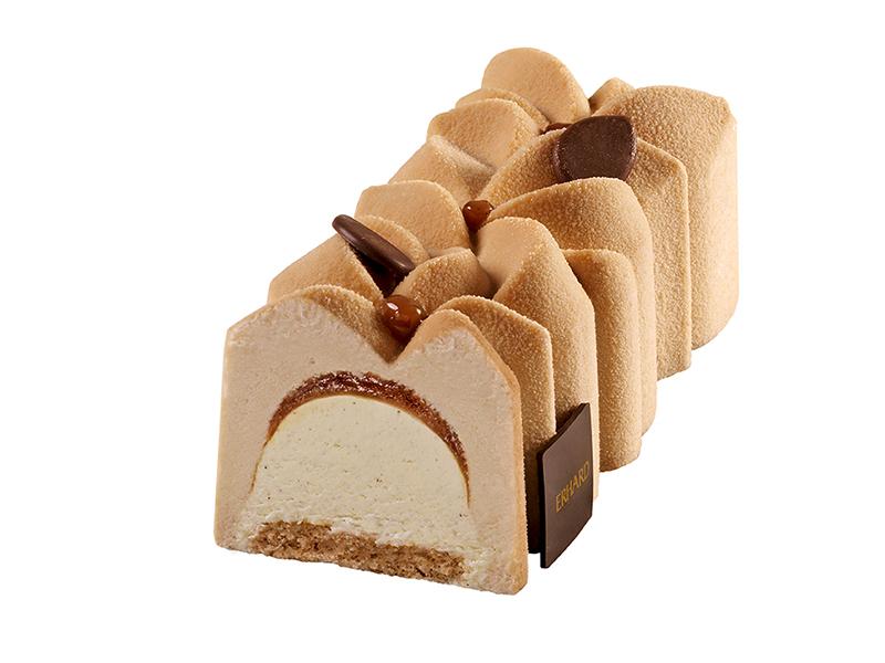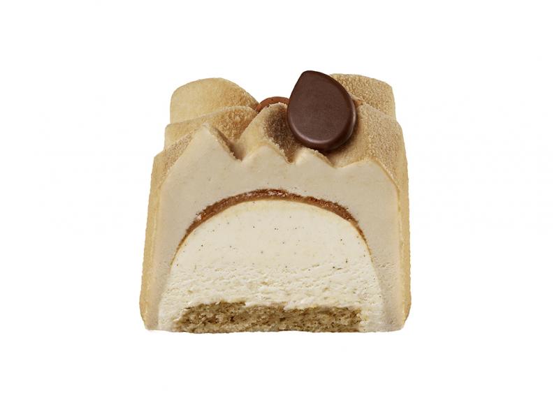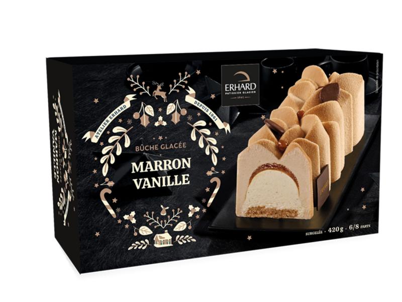 Bûche glacée composée d'une crème glacée à la crème de marrons, d'une crème glacée à la vanille, d'un biscuit crumble amande-châtaigne, d'une sauce crème de marrons et de décors - surgelée.