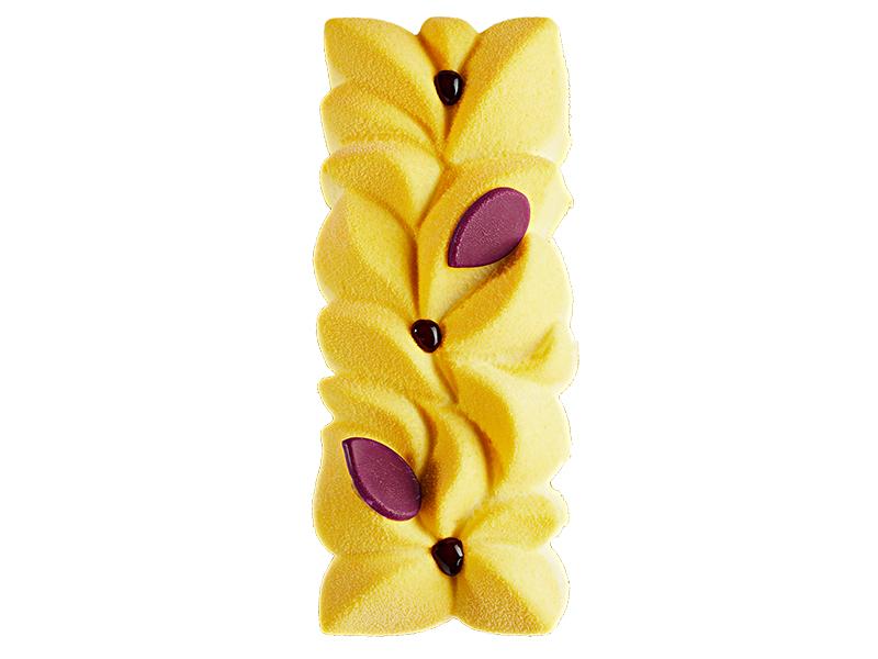 Bûche glacée composée d'une crème glacée à la noix de coco, d'un sorbet plein fruit à la banane et au fruit de la passion, d'un biscuit à la noix de coco, d'une sauce à la mangue et au fruit de la passion et décors - surgelée.