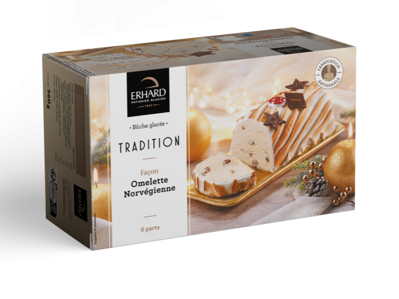 Crème glacée vanille, meringue chalumée, génoise imbibée d'un sirop au rhum, raisins macérés au rhum et décors - surgelée.