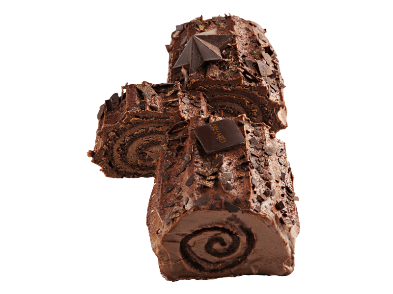 Crème au beurre au chocolat, biscuit au cacao imbibé de sirop et décors en chocolat - surgelée.