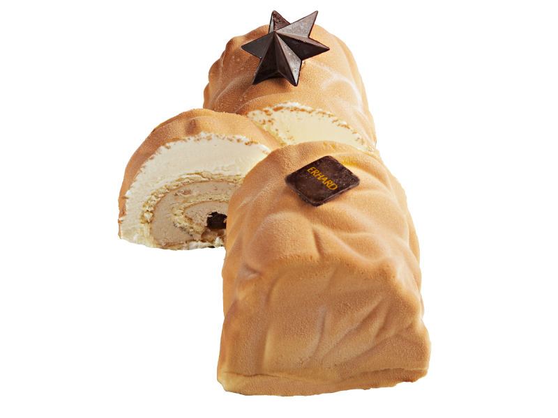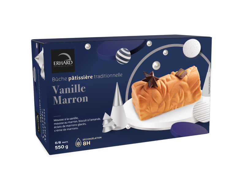 Mousse vanille, mousse marron, biscuit à l'amande, éclats de marrons glacés, crème de marrons et décors - surgelée.