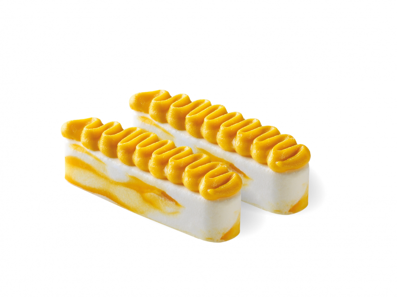 2 entremets glacés composés d'une crème glacée à la noix de coco, d'un sorbet plein fruit à la mangue et d'une préparation à la mangue et au fruit de la passion.