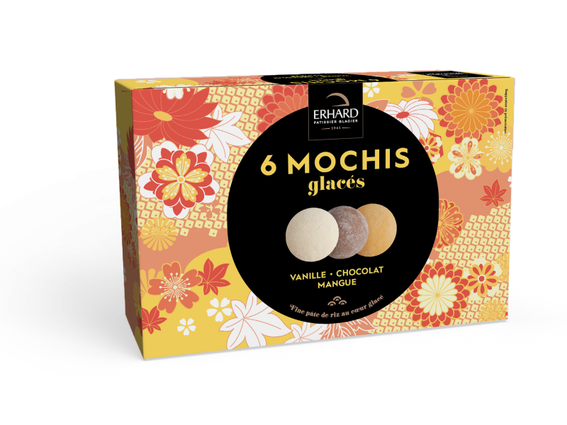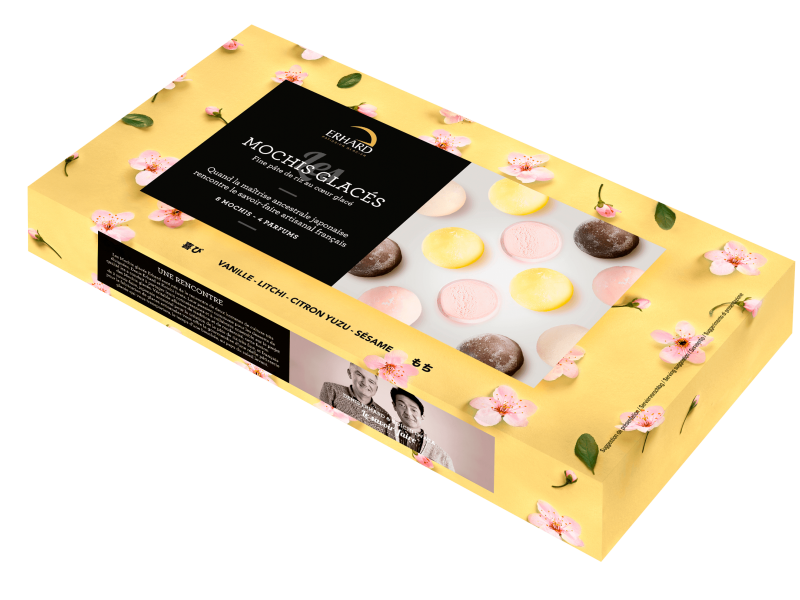 Entremets glacés composés de crème glacée à la vanille ou au litchi ou au citron yuzu ou au sésame (64%), entourée de pâte de riz sucrée cuite- Surgelés.