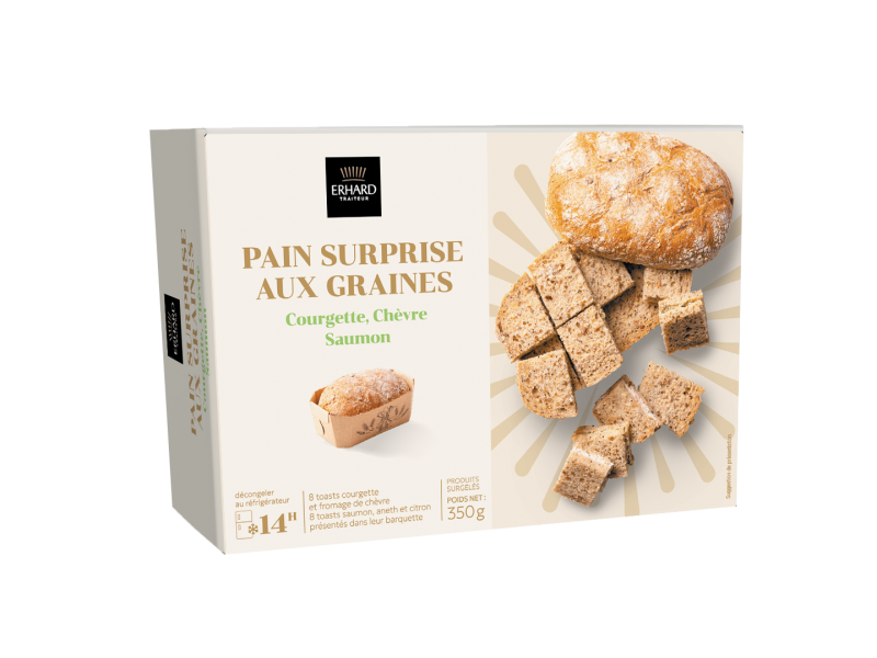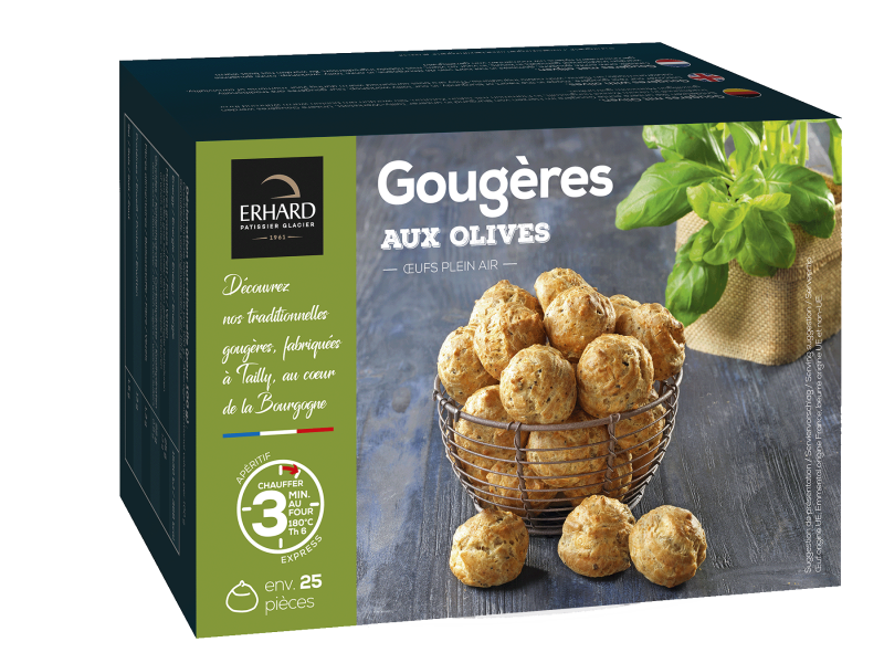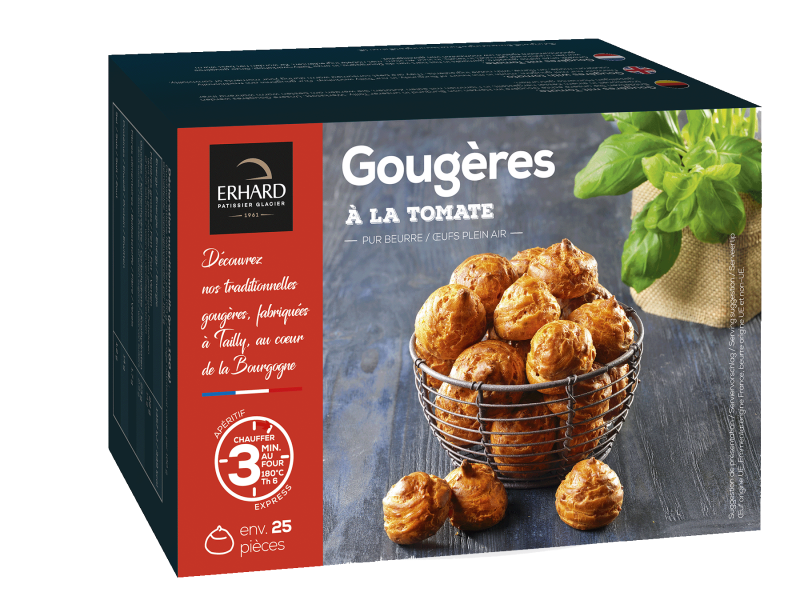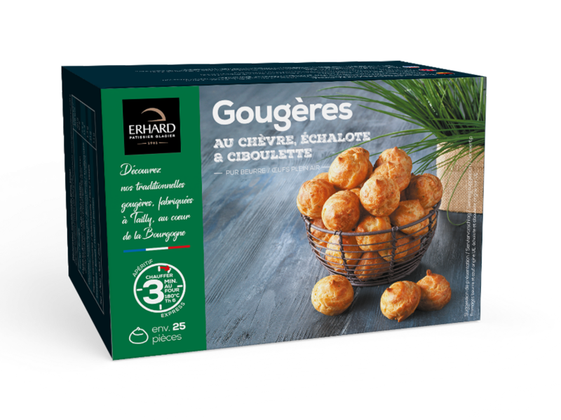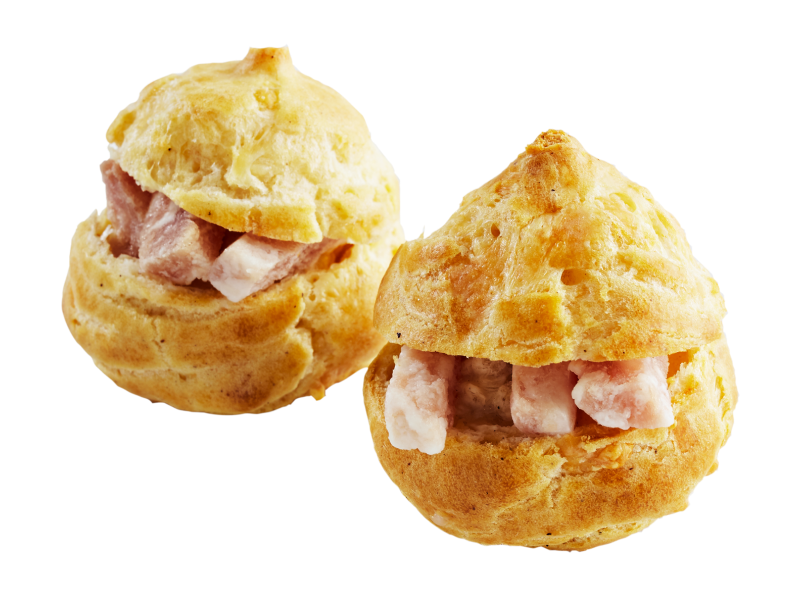Gougères garnies d'une préparation à base d'une spécialité laitière au fromage blanc, à l'emmental, aux oignons et aux lardons cuits fumés.