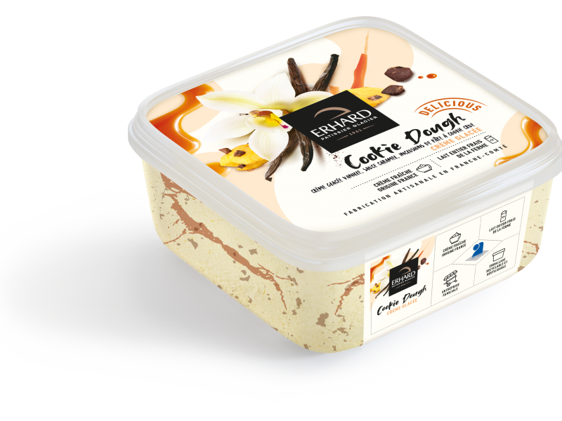 Crème glacée à la vanille marbrée de caramel au beurre salé avec des morceaux de pâte à cookie contenant des pépites de chocolat.