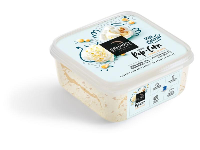Crème glacée saveur pop-corn marbrée de caramel au beurre salé avec des éclats de caramel aromatique au beurre et à la crème et pop-corn sucré.