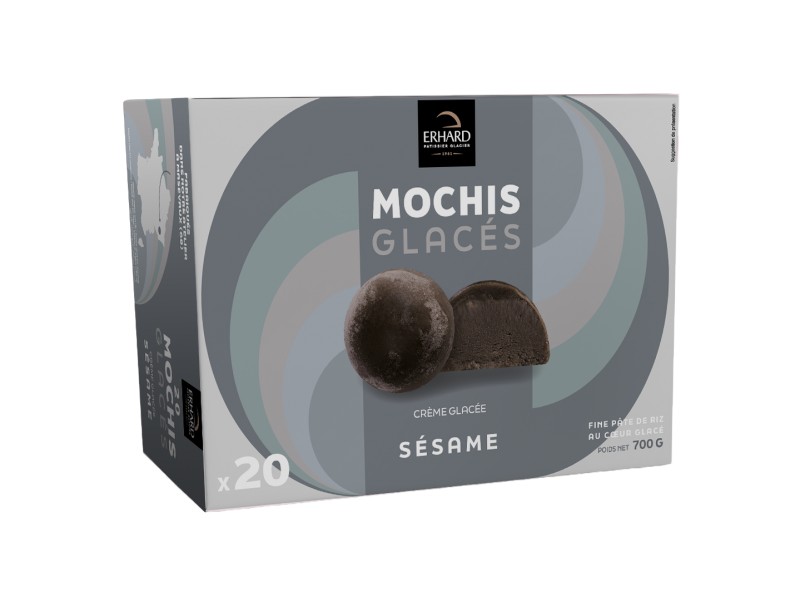 Entremets glacé composé de crème glacée au sésame noir (63%) entourée de pâte de riz sucrée cuite (36%) - Surgelé.