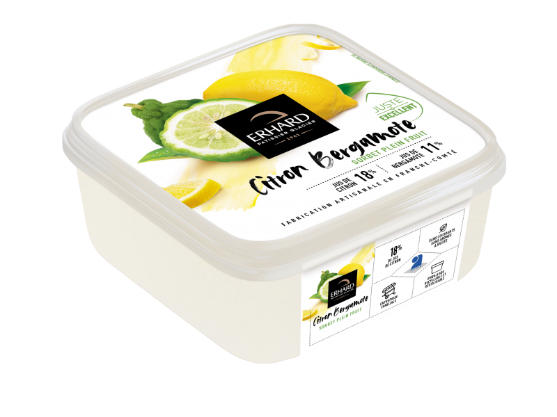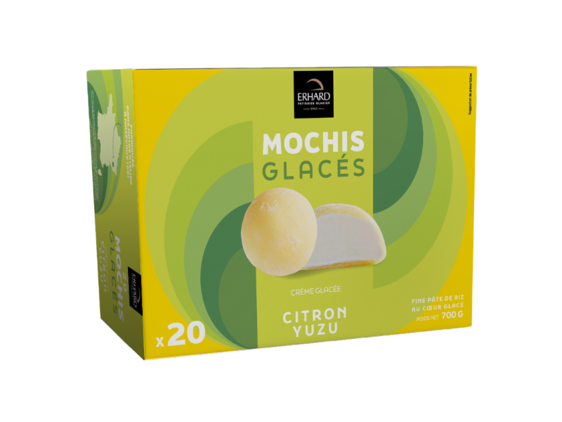 Entremets glacés composés de crème glacée au citron et au yuzu (63%) entourée de pâte de riz sucrée cuite (36%) - Surgelés.
