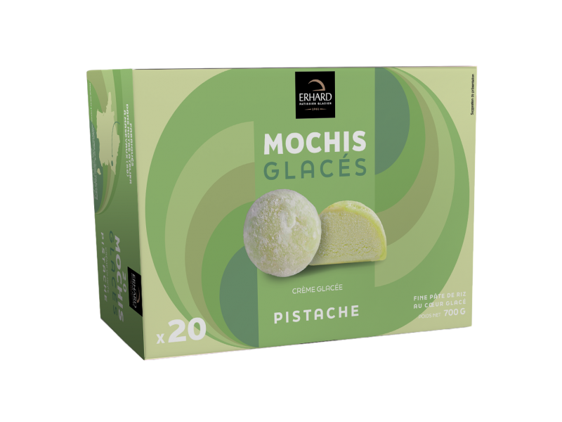 Entremets glacés composés de crème glacée à la pistache (63%) entourée de pâte de riz sucrée cuite (36%) - Surgelés.