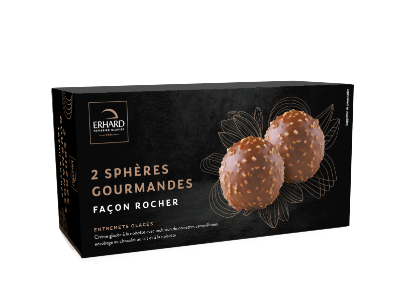 Entremets glacé composé d'une crème glacée à la noisette avec inclusion de noisettes caramélisées 84,4%, d'un enrobage au chocolat au lait et à la…