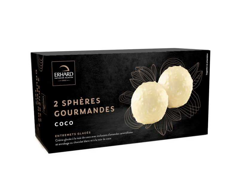 Crème glacée à la noix de coco marbrée d'une préparation parfum chocolat noisette.