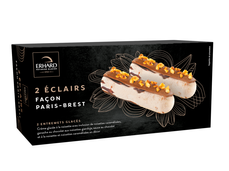Entremets pâtissier composé d'une crème montée à la vanille (53,3%), d'une pâte à choux pur beurre (33,3%) et d'une sauce cacao-noisette (13,3…