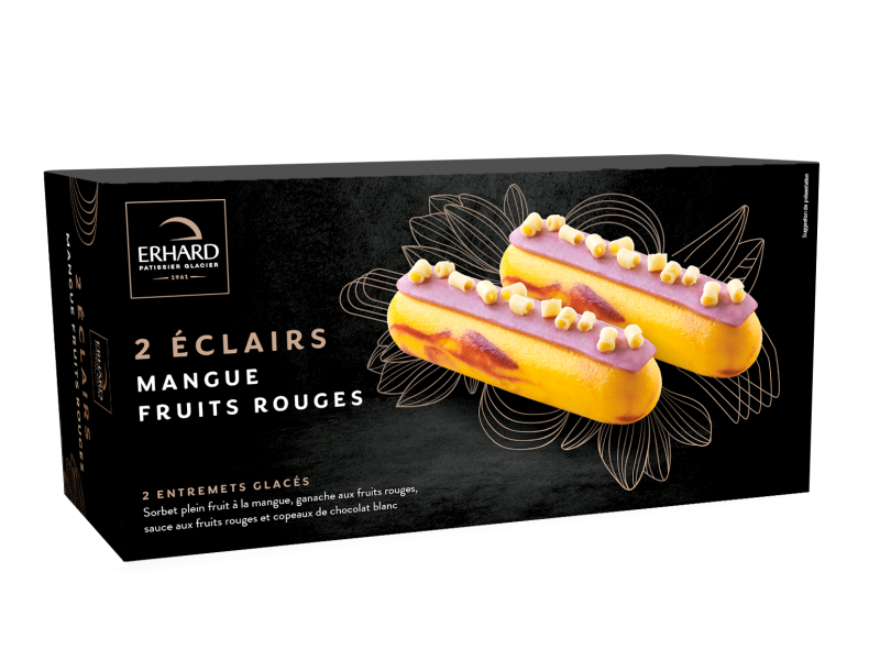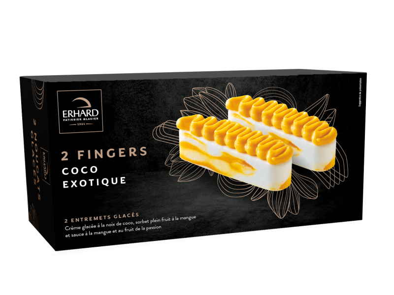 2 entremets glacés composés d'une crème glacée à la noix de coco 72,4%, d'un sorbet plein fruit à la mangue 20% et d'une préparation à la mangue…