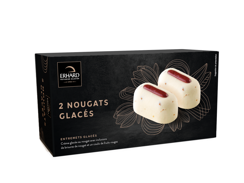2 Entremets glacés composés d'une crème glacée à la pâte de nougat 88,4% avec inclusions de brisures de nougat 6,6% et d'une préparation aux fruits…
