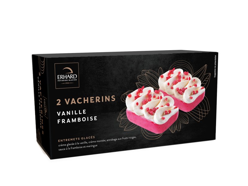 Entremets individuels glacés composés d'une crème glacée à la vanille 60,5%, d'une crème montée 11,9%, d'un enrobage aux fruits rouges 11,9%, d…