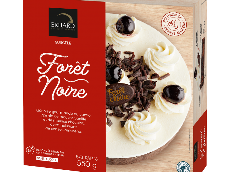 Entremets pâtissier composé d'un biscuit au cacao maigre imbibé d'un sirop 32%, mousse à la vanille 29%, mousse au chocolat 22%, brisures de cerises…