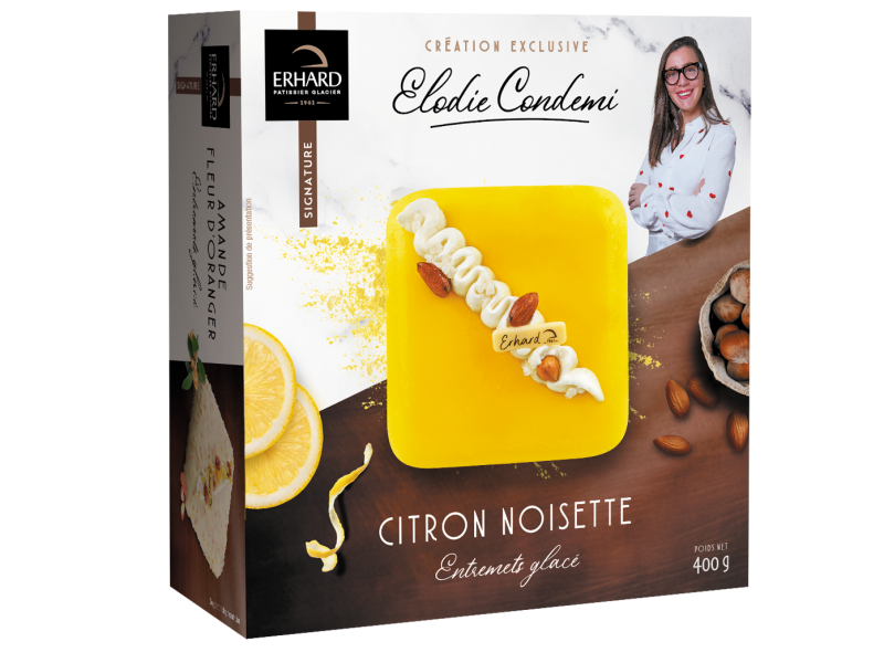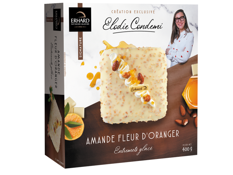 Entremets glacé composé d'une crème glacée à la pâte de nougat de Montélimar 89,6% avec inclusions de brisures de nougat de Montélimar 7,8% et d'une…