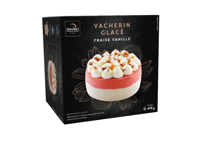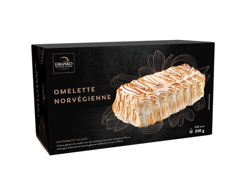 Entremets glacé composé d'une crème glacée à la vanille avec des inclusions de raisins macérés au Rhum 68,2%, d'une meringue chalumée 22,3% et d…