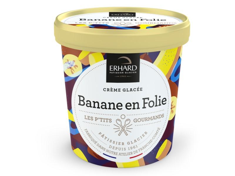 Crème glacée à la banane du Costa Rica avec une préparation de caramel au beurre aromatisée et des morceaux de biscuit.
