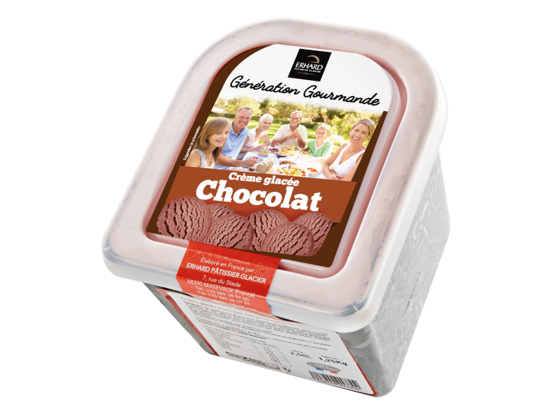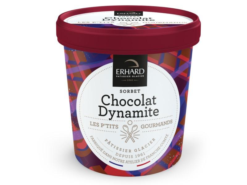 Sorbet au chocolat (80%) avec des éclats de chocolat (8%) marbrée d'une sauce au chocolat (12%).
