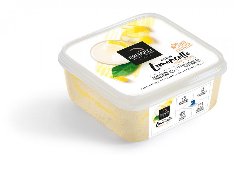 Crème glacée à la liqueur de citron aromatisée et au citron, marbrée d'une préparation à la liqueur de citron aromatisée.