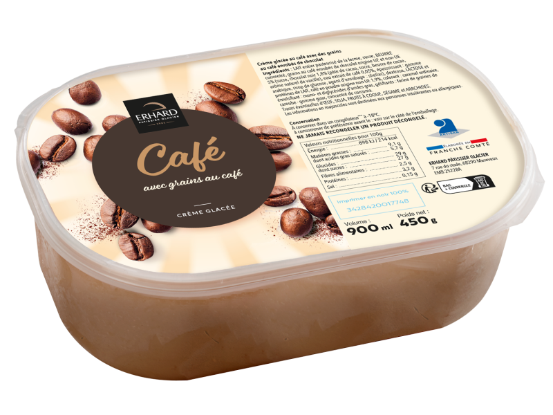 Entremets pâtissier composé d'un fourrage au café (48%), d'une pâte à choux pur beurre (35%), et d'un glaçage au café - produit surgelé.