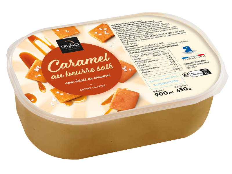 Crème glacée au caramel, au beurre et au sel de Guérande avec des éclats de caramel.