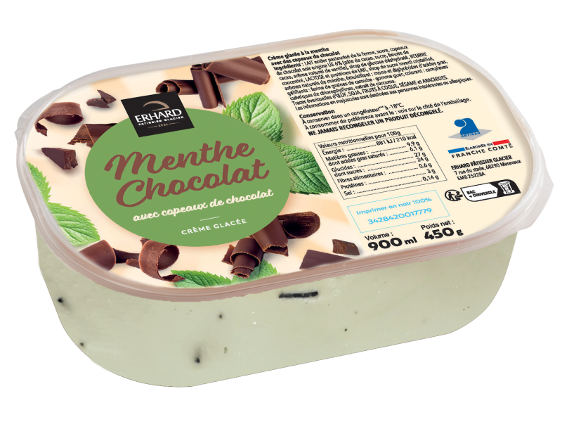 Crème glacée à la menthe avec inclusions de copeaux de chocolat noir.