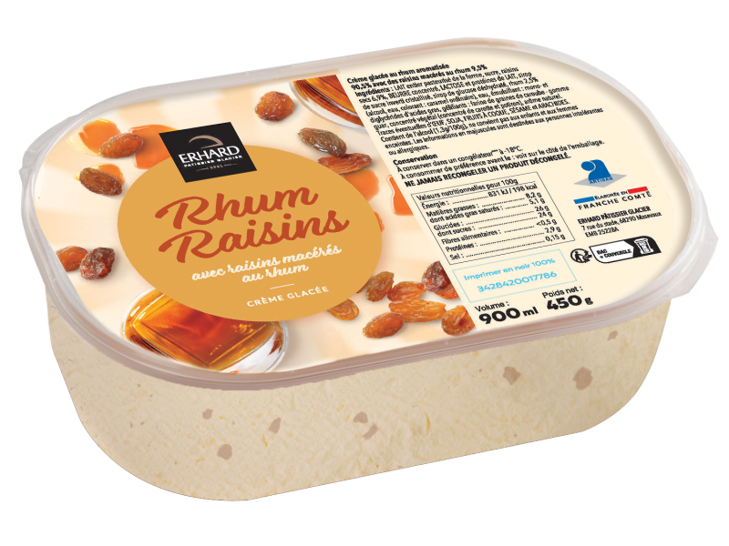 Crème glacée au rhum aromatisée 90.5% avec des raisins macérés au rhum 9.5%.
