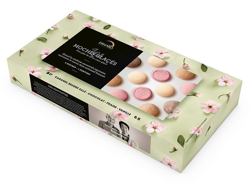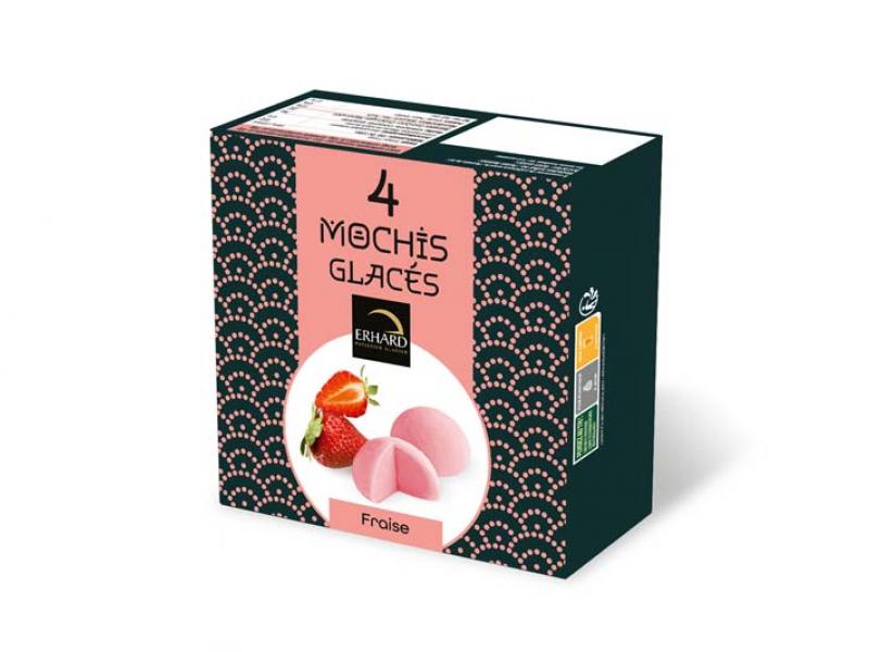 Entremets glacés composés de crème glacée à la vanille ou au litchi ou au citron yuzu ou au sésame (64%), entourée de pâte de riz sucrée cuite- Surgelés.