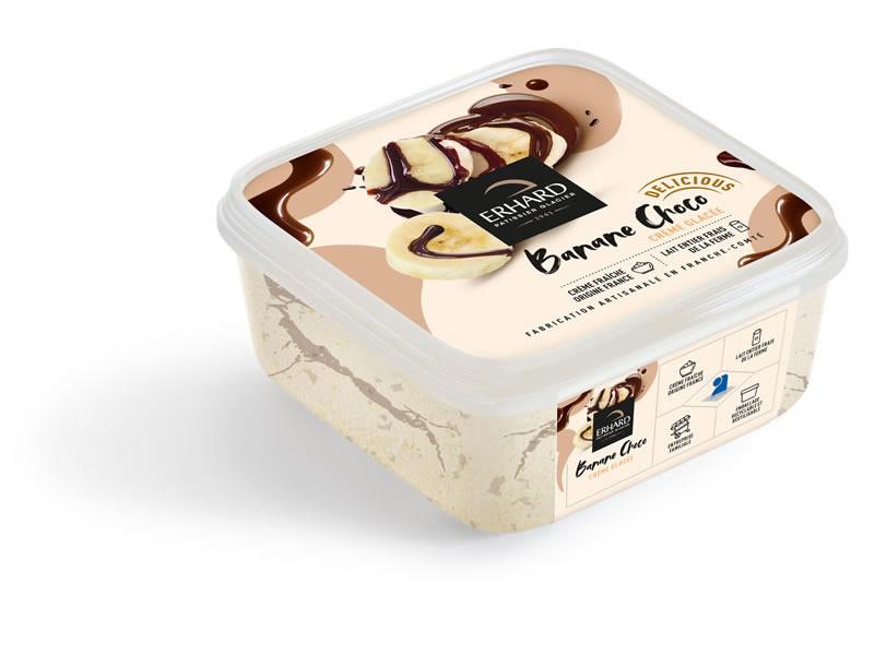 Crème glacée à la banane avec une préparation au chocolat et des copeaux de chocolat noir.