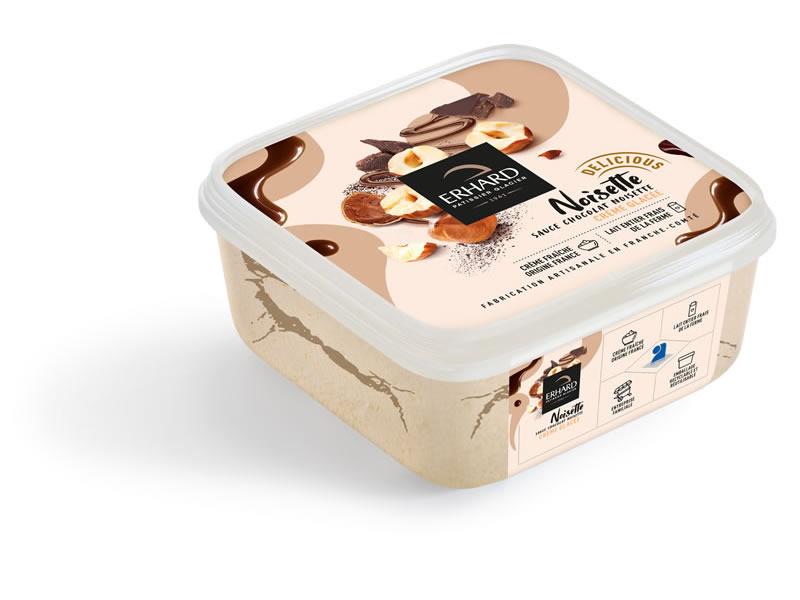 Crème glacée à la noisette 81.4% avec une préparation aux chocolats et à la noisette 18.6%