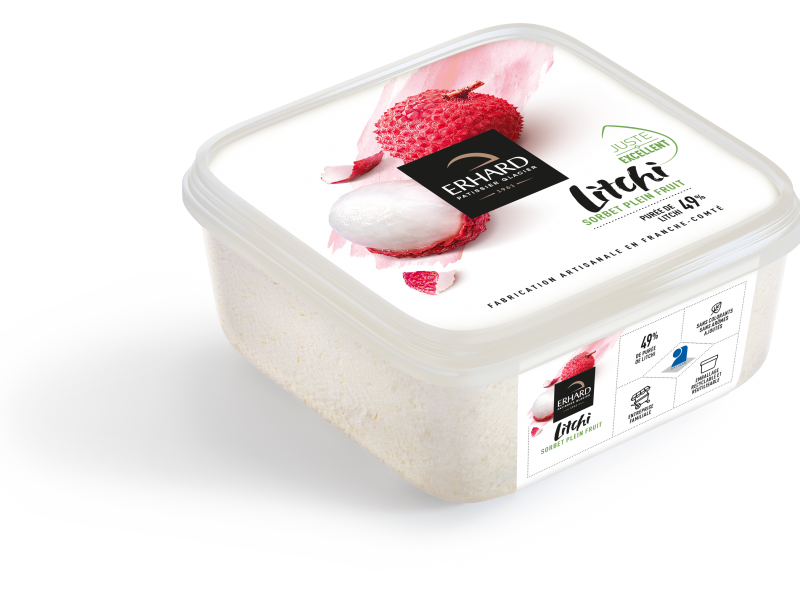 Entremets glacés composés de sorbet mangue Alphonso des Indes, crème glacée à la noix de coco, saveur fleur de cerisier ou au thé vert Matcha du Japon (63%)…