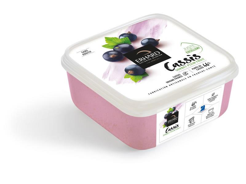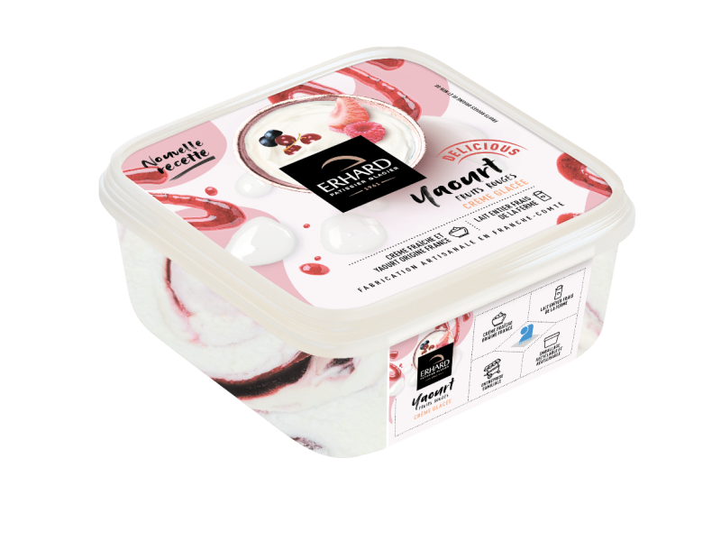 Crème glacée au yaourt 85% avec une préparation aux fruits rouges 15%.