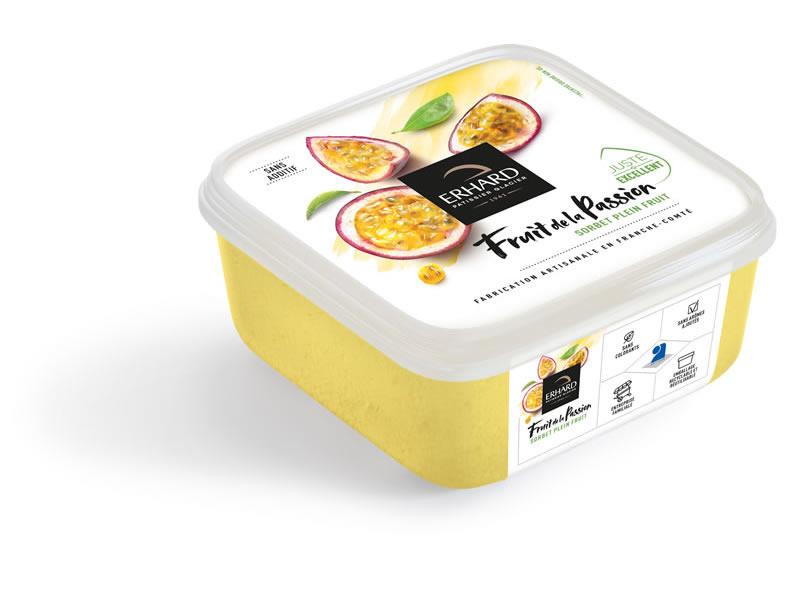 Crème glacée au yaourt avec une préparation à la mangue et au fruit de la passion.