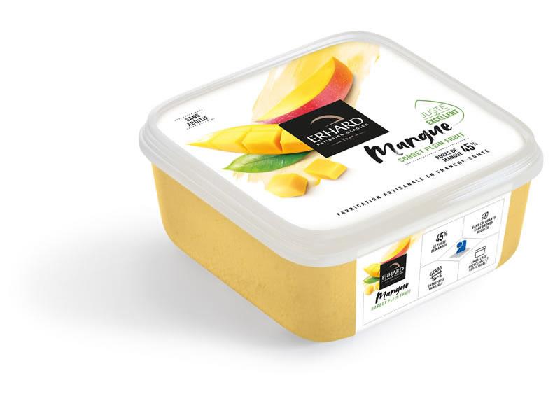 Entremets glacés composés de sorbet plein fruit à la mangue (63%) entourée de pâte de riz sucrée cuite (36%) - Surgelés